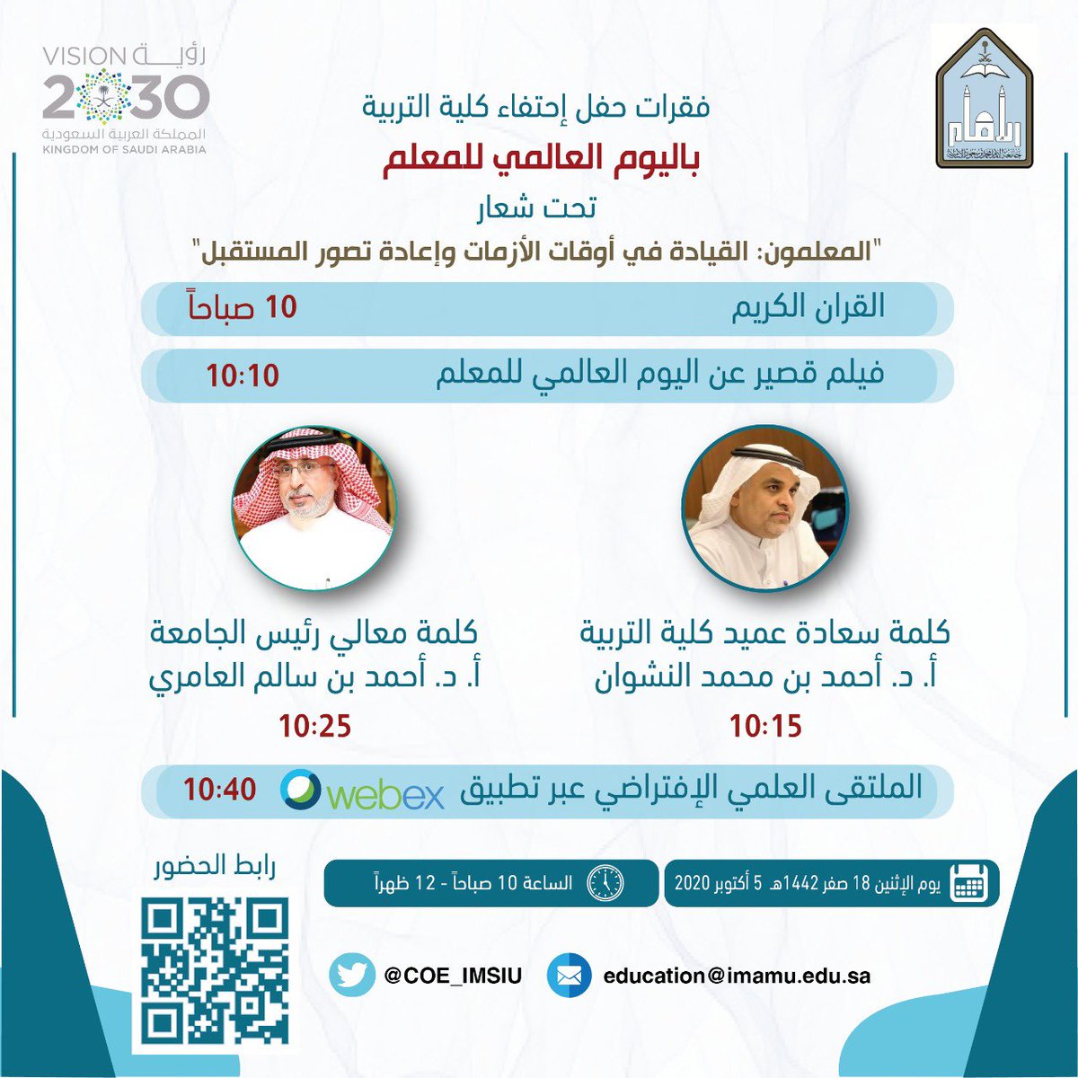 جامعة الإمام محمد بن سعود الإسلامية On Twitter غدا عند العاشرة صباح يوم الإثنين 18 صفر 1442هـ معالي رئيس جامعة الإمام أ د أحمد بن سالم العامري يدشن الملتقى العلمي لكلية التربية احتفاء